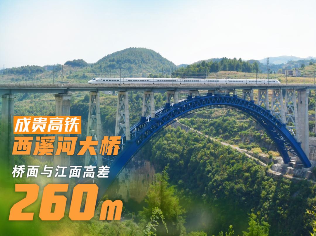成贵高铁西溪河大桥,位于贵州省毕节市大方县与黔西县交界处,是我国高铁首座钢管混凝土转体拱桥。大桥全长494米,最高桥墩60米,桥面至江面260米。