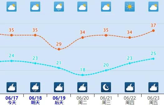 预计周末高温范围和强度陆续缩小减弱,到了周日,中南大部最高气温将降至35℃附近。