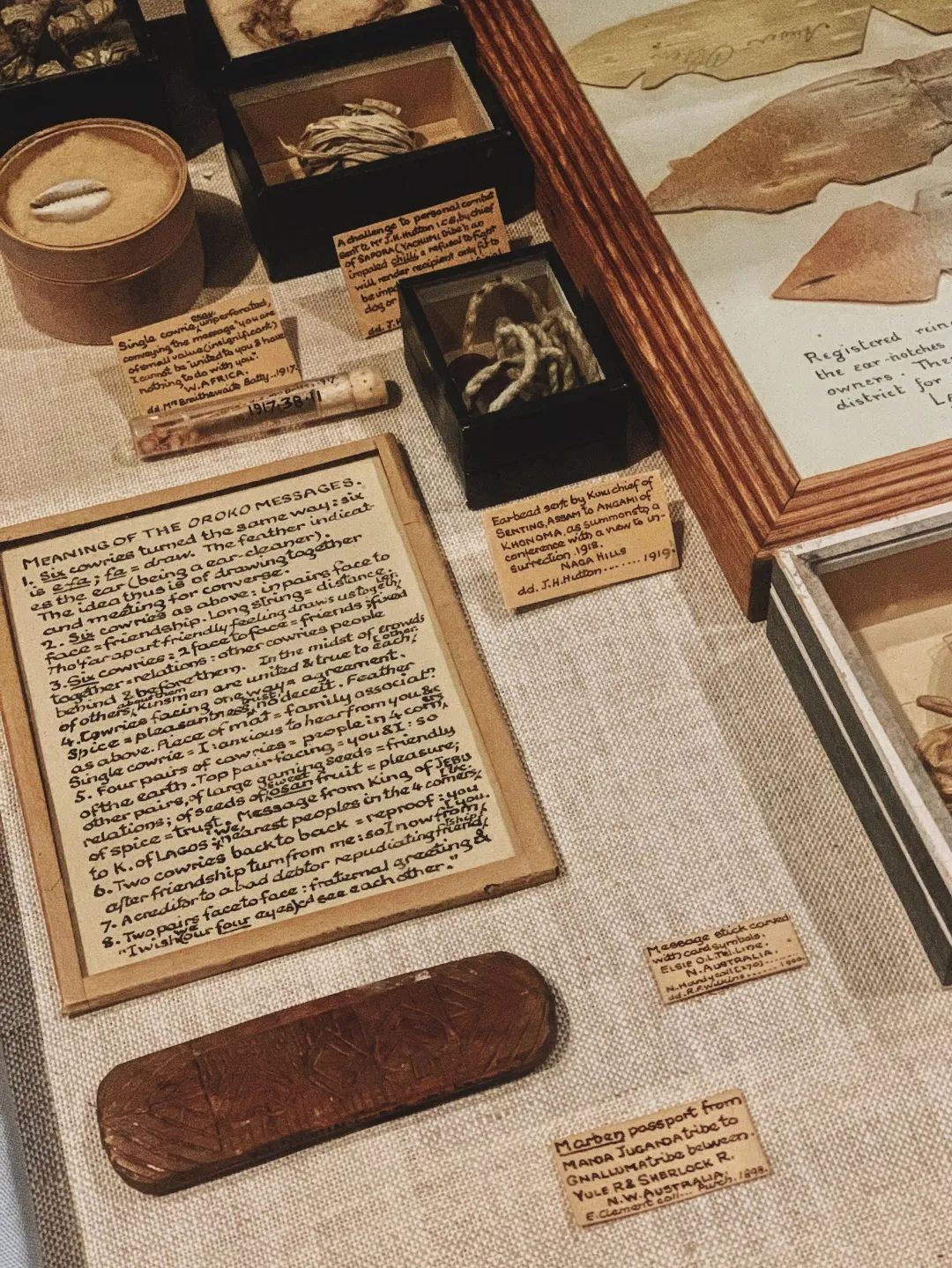 尽管看过很多照片,真正站在这些展品面前还是觉得震撼,不论是展柜还是橱窗都非常拥挤,博物馆展出了绝大部分收藏,而且几乎所有的藏品都带有标签,第一批古老的手写标签鲜少被替换,即便褪色、难以辨认,价值观在今天看来也有问题——博物馆官网上的描述是“贬低、损人”,但仍旧被保存下来,因为“体现的是第一批博物馆工作人员的思维方式,也是人类学的历史片段”;全部替换成新标签,“整个博物馆的气质就会改变”。这种有意识的保留也是博物馆直面殖民、屠杀等黑暗过去的方式。