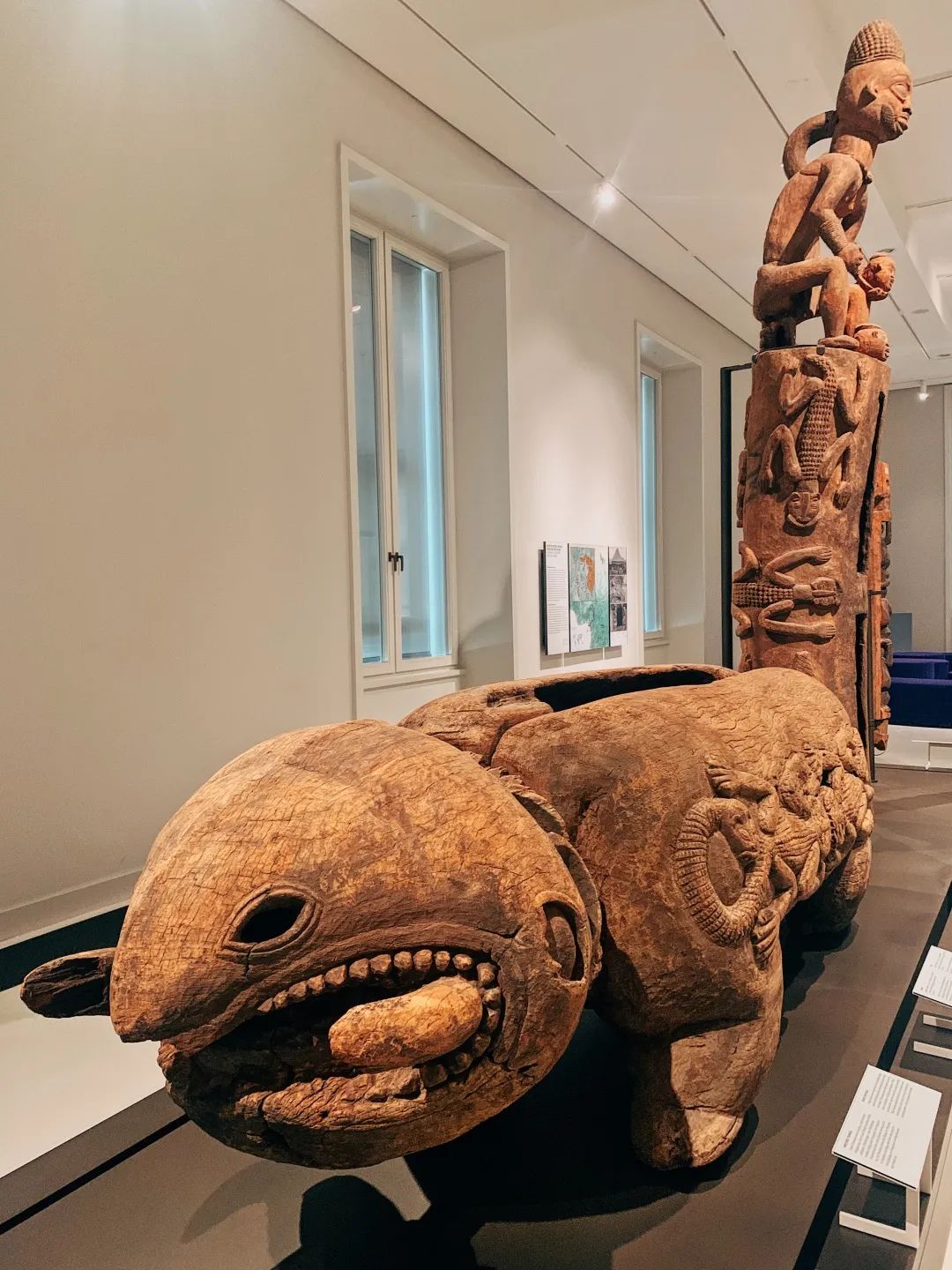 另一些木雕虽然分开展出,但有些传统上都应该是立在屋前的。仰望它们如同仰望祖先和神明,在氤氲潮湿的岛屿世界,人们感觉深受其庇护。洪堡论坛里还有比人高的鼓、南美洲原住民帝王收到的礼物等。