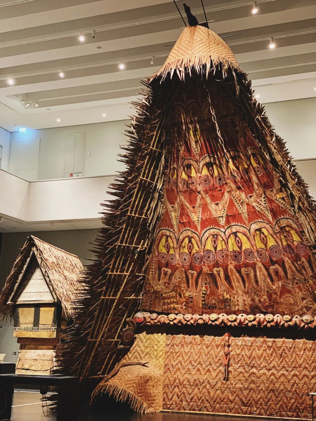 巴布亚新几内亚阿贝拉姆人(Abelam)的祭祀用屋如今已经不再建造了,展厅里的这个也是复制品,它相当华丽,有彩绘的墙面和两个居室,屋里立着神明的雕像。