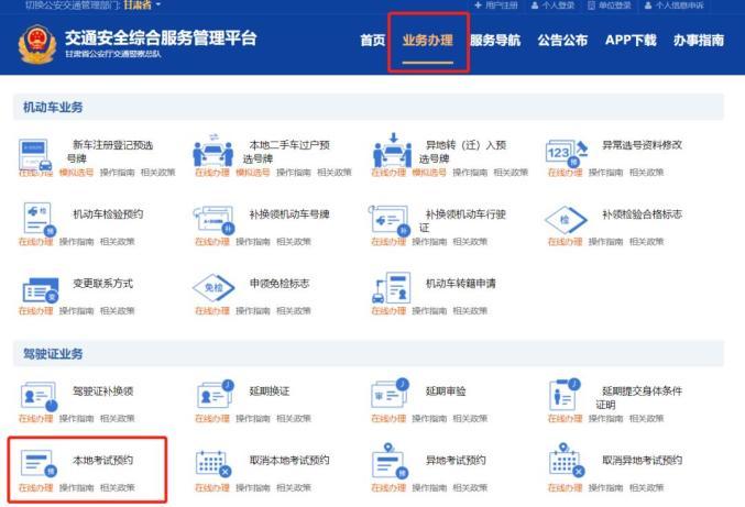 或者注册登录交通安全综合服务管理平台,在首页点击“业务办理”,在“驾驶证业务”中选择“本地考试预约”,填写相关材料在线办理。