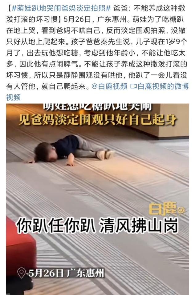 微博上有则热点#萌娃趴地哭闹爸妈淡定拍照#。那是在广东惠州,一位1岁9个月大的小男孩想要吃糖,但爸爸妈妈担心吃太多糖对他身体不好,就拒绝了孩子的要求。