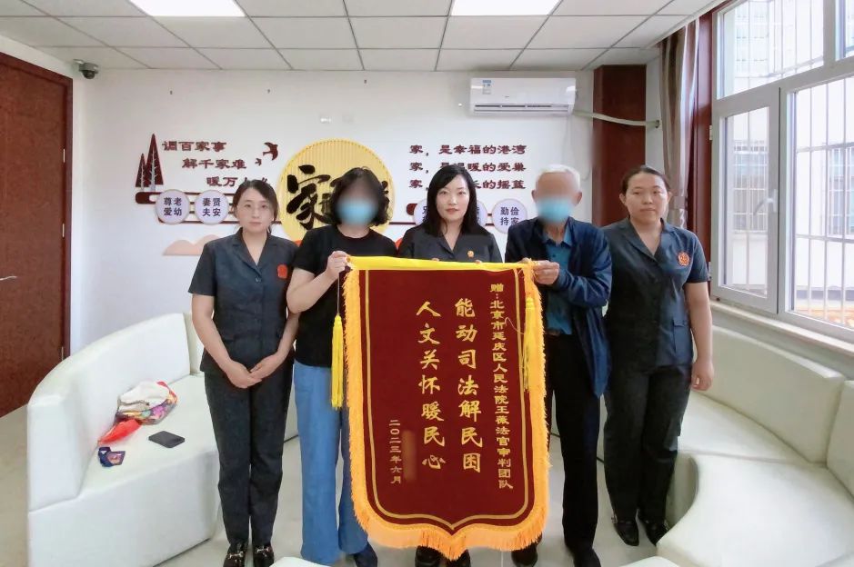 6月9日下午,赵大姐与老公公一起来到延庆法院法融万家工作室赠送锦旗。她哽咽地说道:“之前听您的助理说,你们法院现在都在推行能动司法。您就是用这个能动司法帮我们解决了难题。王法官,真的谢谢您,要不然我们全家真的活不下去了!”说着便泣不成声。看着这个压抑许久终于释放情绪的女人,同为女性的我泪水也在眼眶里打转。我强忍眼泪宽慰她:“这个时候你一定要坚强,相信一切都会变好的!我们也都会尽自己的力量来帮助你们渡过难关!”赵大姐听后站起来向审判团队深深鞠躬。良久,她起身拉着我的双手说:“真的,我原本已经对生活彻底失去了信心,甚至有过不好的念头,但是这十天以来通过与你们反复接触,我又看到了生的希望,也相信一切会慢慢变好。”一旁的老公公也接过了话茬:“对,生活中就没有过不去的坎儿,日子总会好起来的!”看着眼前重新燃起生活希望的两人,我再一次鼓励道:“希望有一天,你们能来申请恢复刘大哥为完全民事行为能力人,我等着你们的好消息!”
