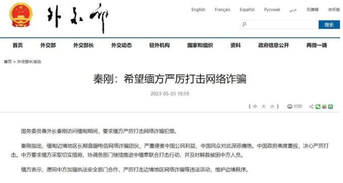 今年5月初, 国务委员兼外交部长秦刚访问缅甸期间,就曾郑重向缅方提出:“缅甸边境地区长期盘踞电信网络诈骗团伙,严重侵害中国公民利益,中国民众对此深恶痛绝。中国政府高度重视,决心严厉打击。”