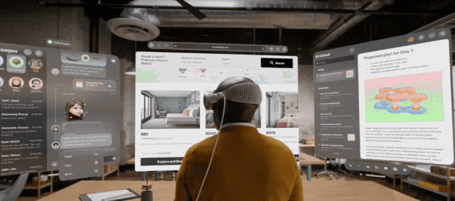 通过Vision Pro,你可以为你的生产力创造一个完美的空间。我们对消费者展现了一些场景。对那些试图借此完成工作的人来说,它是一款超级强大的设备。visionOS是一个非常强大的多应用程序、多任务操作系统,它将带来惊人的生产力和专业场景。