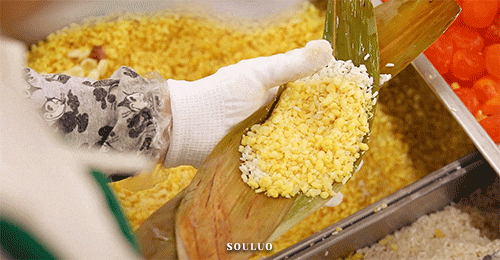 据传潮州地区喜欢用糯米粉,按比例渗入栀子汁、食碱液、茶水混合,用纱布包裹装入竹箕蒸熟而成。煮熟的栀粽,色彩金黄,光滑发亮,味道虽带着一丝丝草本灰的苦,但是蘸上糖粉之后,甘香爽口。广东的粽子宇宙