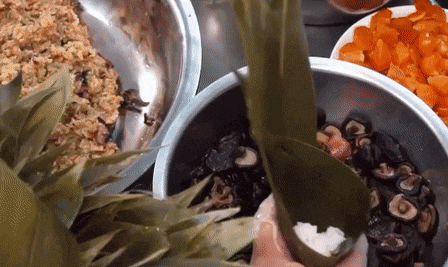 蛤蒌粽有着特殊的香气,使用蛤蒌叶、糯米、五花肉、蛋黄等材料精制而成,煮熟后的蛤蒌叶是暗绿色,夹杂在白胖白胖的糯米上,令人垂涎三尺。