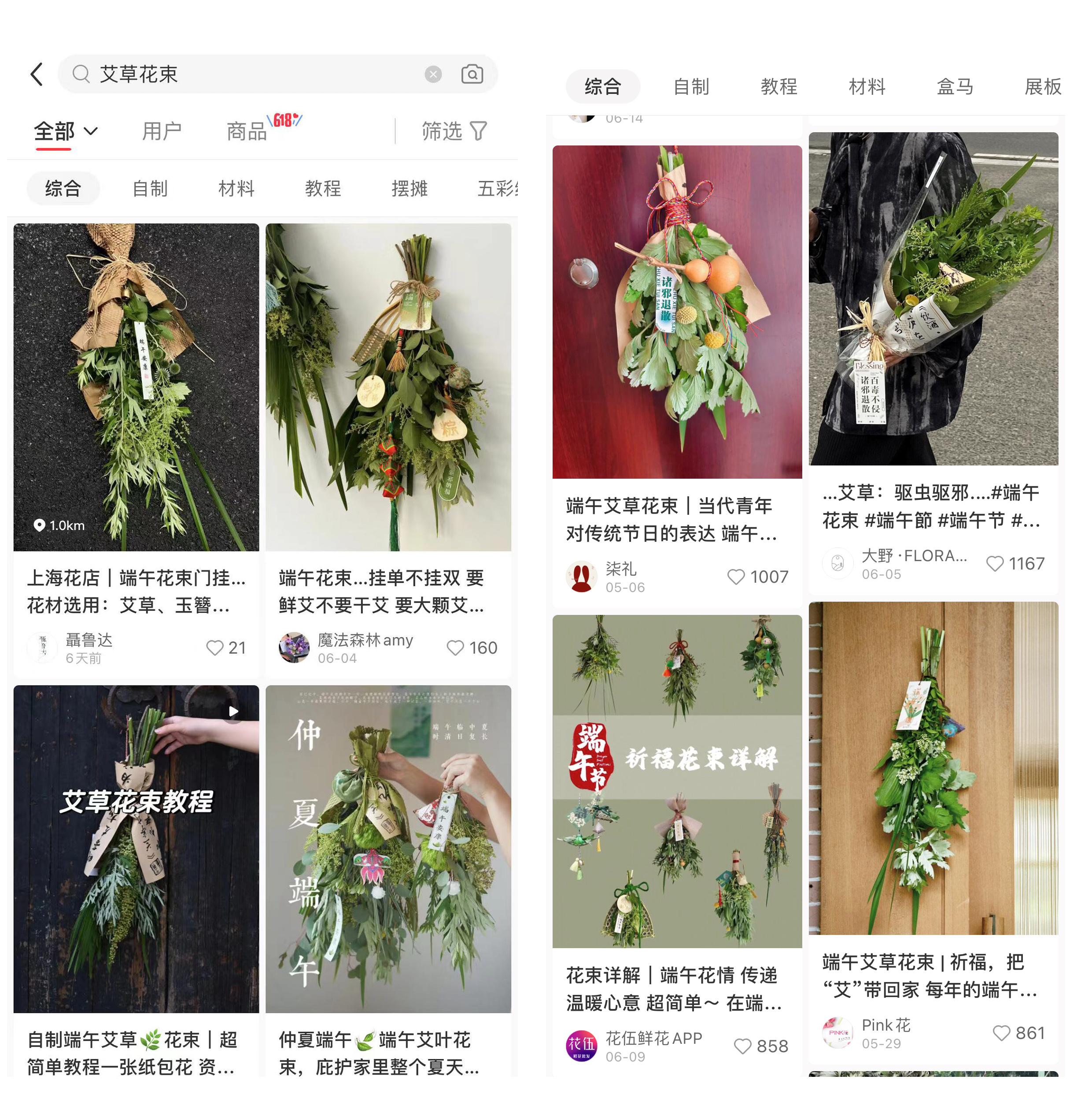作为一个“颜控”,可以说我立刻就被艾草花束的颜值击中了,加入了购买大军。幺幺发我的是一家花店组织的团购,都是纯手工制作,数量有限,没多久就售罄了。我好奇地打开某红色社交软件,以“艾草花束”作为关键词进行搜索,发现了铺天盖地的美图和制作教程,不少也是出自花店之手。
