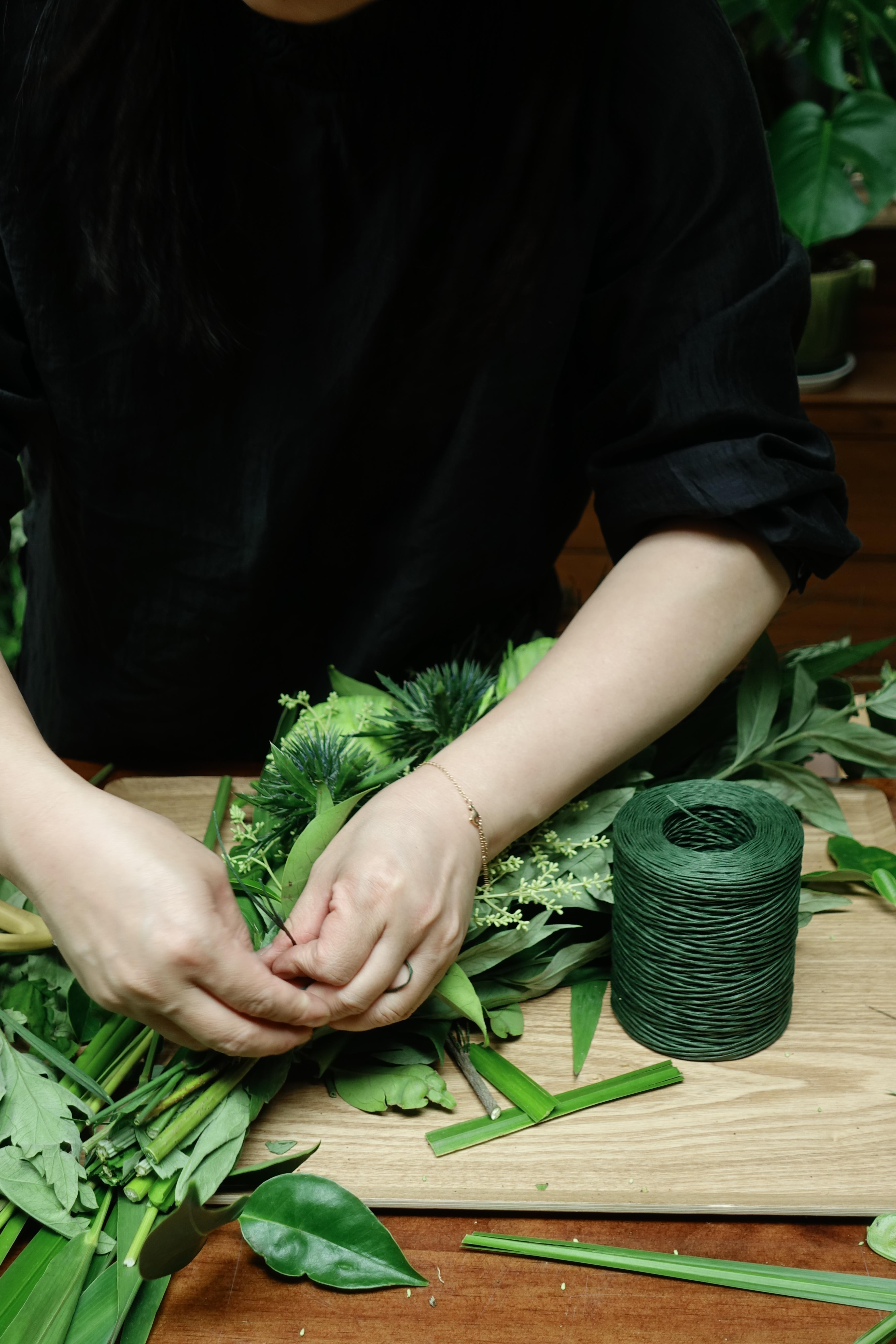 我们会先去掉靠近根部的叶子,因为之后要把它们从底部的位置绑起来。整个花束可以长短搭配,保留长的艾叶,如果想要让整体看起来更饱满,那短的叶子也不用浪费。
