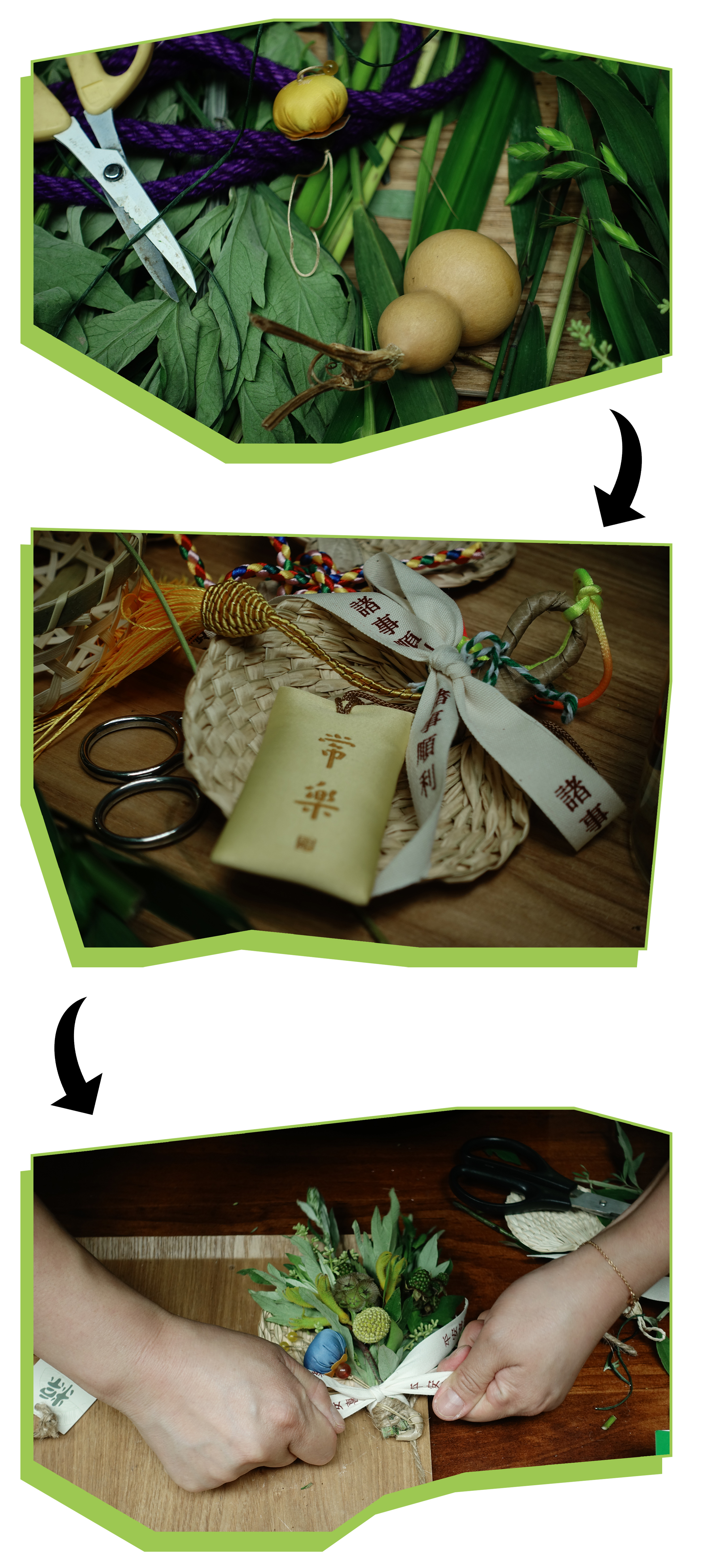 我们会用到的花材,传统来说可能就是艾草、菖蒲、玉簪叶和香樟果,我们把它叫做“端午四件套”,花市里可以买到打包好的。艾草可以驱虫、“招百福”,而菖蒲的叶片形状像一把剑,民间说可以“斩千邪”,它们都有很好的寓意。