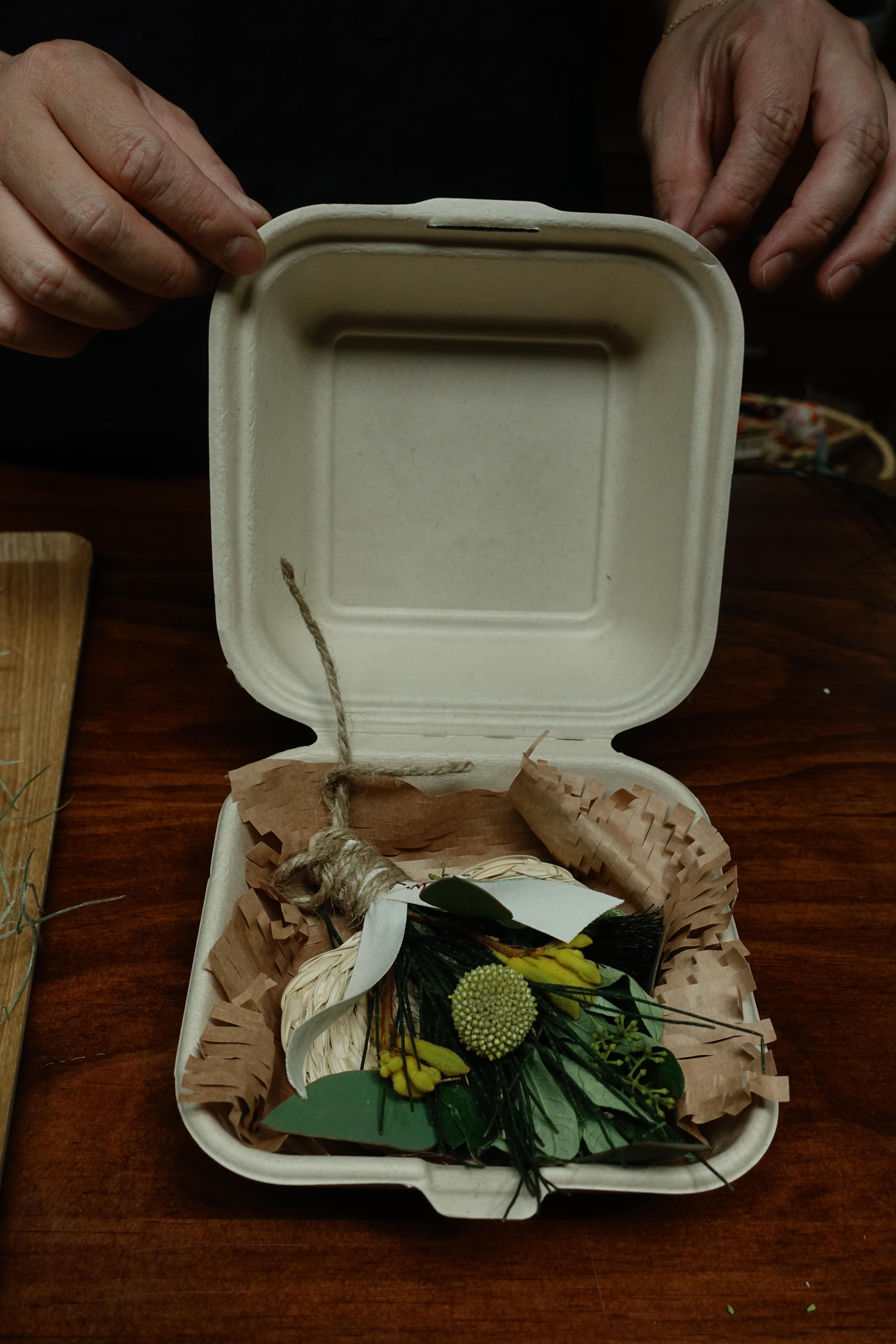 如果艾草花束比较大,我们也可以选择制作这种小号的挂件,挂在车上、办公桌上。我们会使用一些创意的装饰和包装,挂一些写着祝福文字的吊牌和丝带,再装进“外卖盒”和小礼盒里。