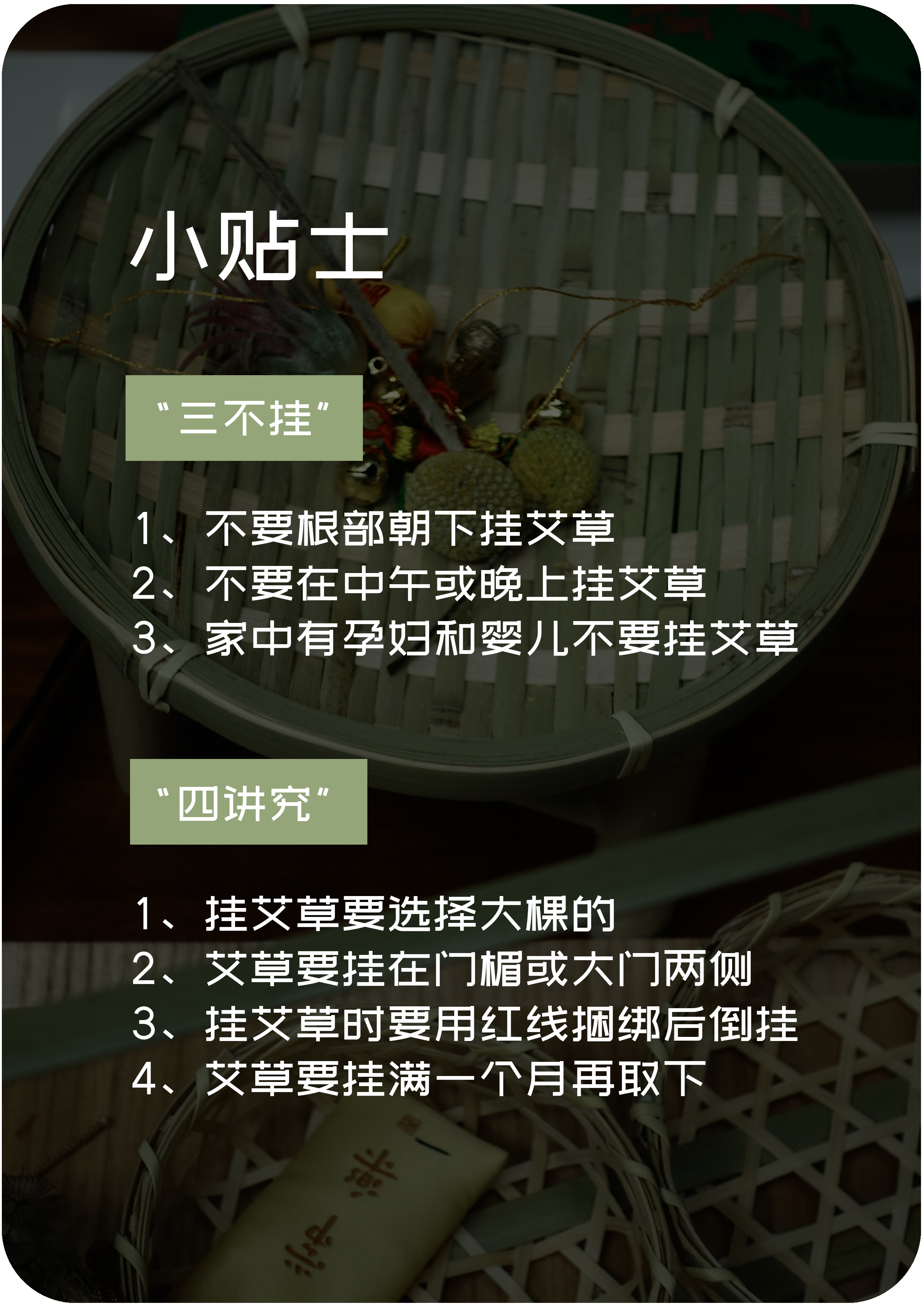️️️跟两位鲜花从业者聊完、目睹了“艾草花束的诞生”,你是不是也觉得小小的艾草其实蕴含着大大的门道?在年轻人爱上艾草花束的同时,他们也在重新爱上端午的习俗文化,用自己的审美和方式赋予这个传统节日新的仪式感。最后,要提醒大家,其实端午挂艾草也是很有讲究的。我查询了一些资料,都放在下面这张“小贴士”里面啦: