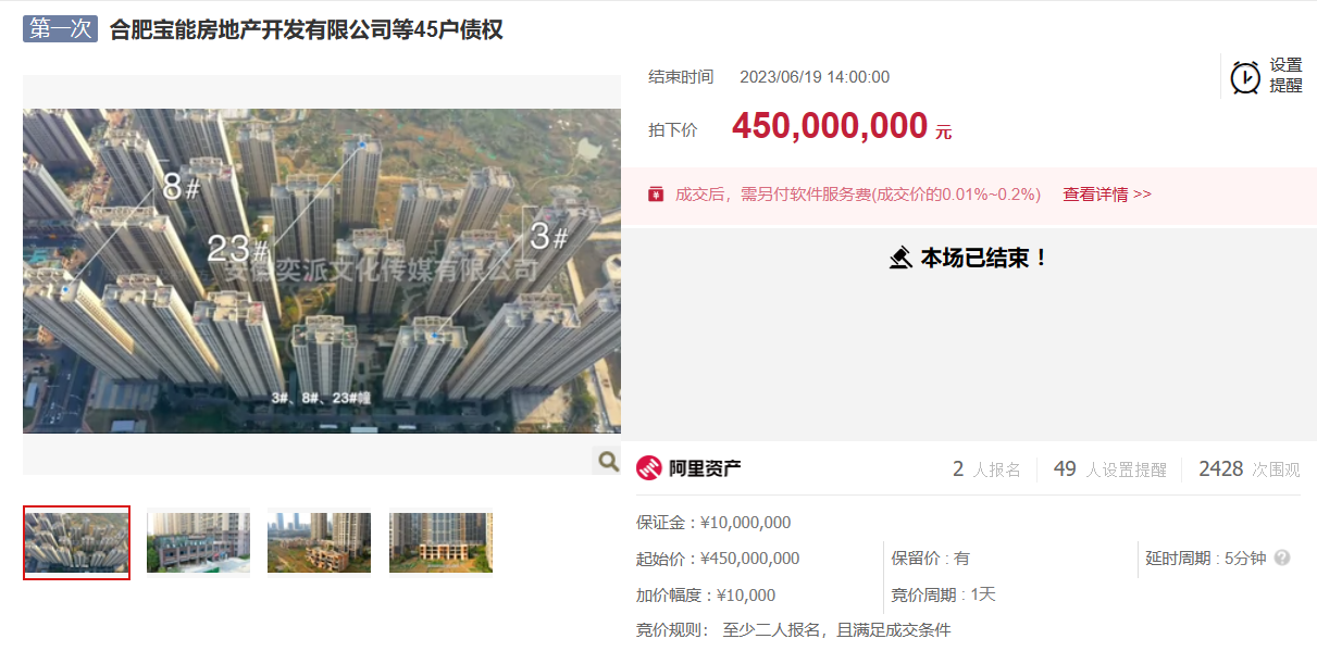 6月20日,据阿里司法拍卖平台披露的资料显示,合肥宝能房地产开发有限公司等45户债权已经在6月19日以4.5亿元底价成交。此次拍卖有两人报名,竞价周期一天。