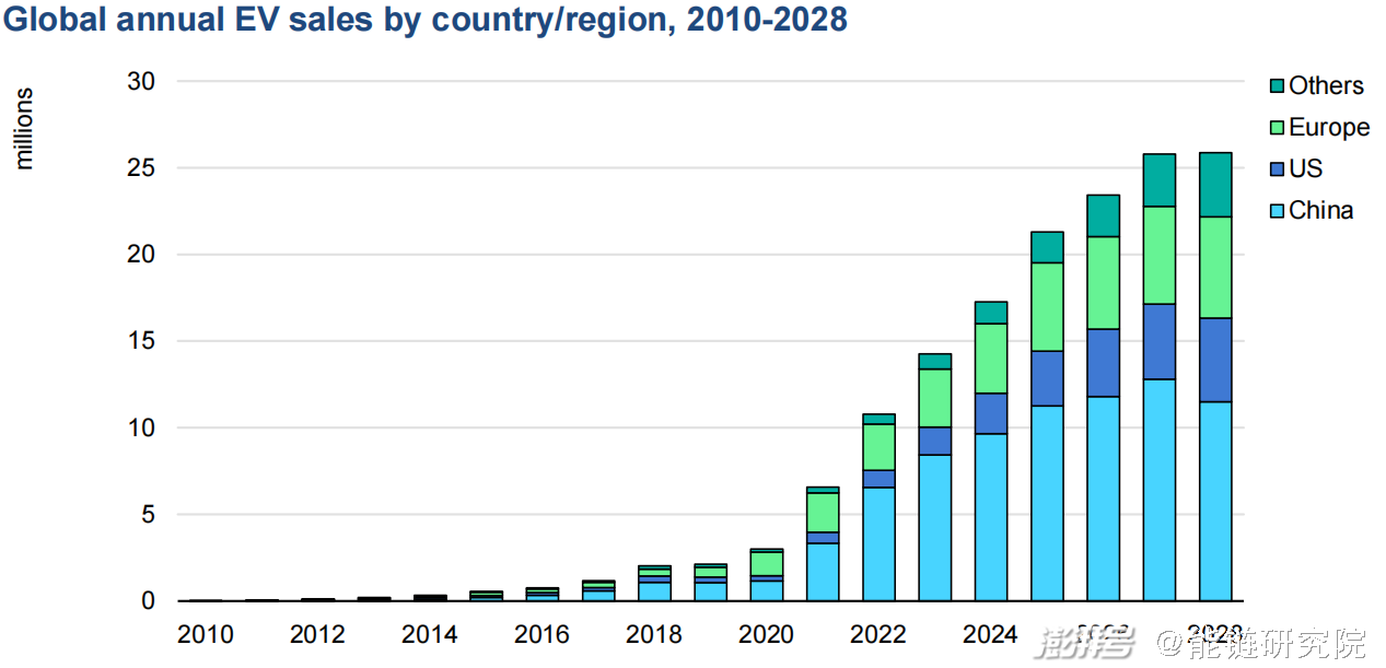 根据国际能源署《2023年全球电动汽车展望》报告,电动汽车的销量从2018年的200万辆上升到2022年的1080万辆,全球每售出七辆汽车中就有一辆是电动汽车。电动汽车的增长趋势将会持续到2028年。