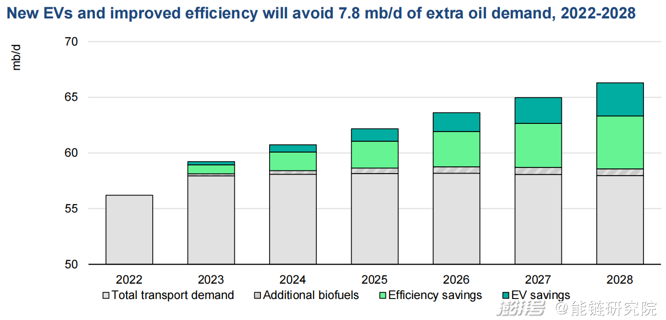 长期以来,运输行业的燃料使用是石油需求的支柱之一。报告预计,随着电动汽车发展、生物燃料使用率和经济性提高,2025年开始,运输行业的燃料需求增长达到日均453万桶的峰值(仅略高于2019年的水平)然后开始逐年下降。电动汽车将替代80%的石油需求增长。