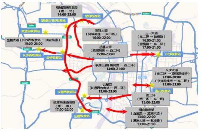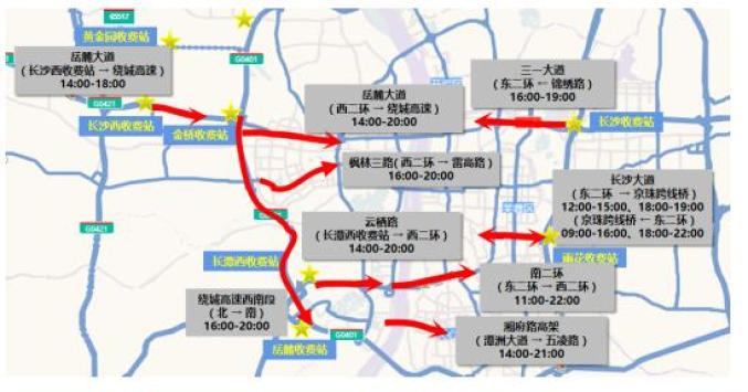 13时起,长沙大道、云栖路、南二环、湘府路大桥、岳麓大道、枫林三路出城车流依次上升;16时三一大道、雷锋大道、绕城高速河西段出城车流逐步上升;22时仅岳麓大道、云栖路、湘府路高架、绕城高速西北段出城车流和长沙大道进城车流依然处于中位运行;23时所有进、出城通道交通基本恢复正常。三、车辆流向