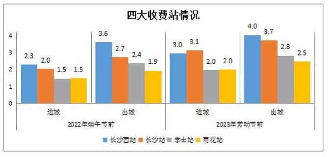 长沙西、长沙、学士、雨花收费站排名前四,这4个收费站车流量进城、出城分别占比25%、28%左右,与之连接的岳麓大道、三一大道、云栖路、长沙大道压力尤其明显。