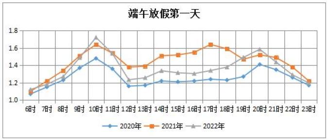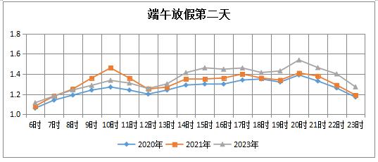 预计端午节晚高峰较日常周五提前到来、推迟结束。13时-22时交通繁忙程度较日常周五大幅上升,小时级拥堵指数在1.5-3之间,是交通出行最为集中时段。15时上升至拥堵状态,17-19时拥堵指数达到峰值,分钟级拥堵指数可能突破3。城区交通22时左右基本恢复正常。二、道路交通状况