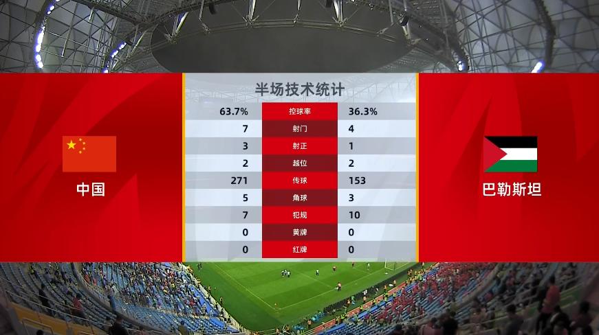 随后的比赛,国足仍有机会攻破对方球门,不过都与进球失之交臂。半场比赛结束,国足在主场1-0手握一球领先进入更衣室,纵观半场技术统计,国足在控球率、射门、射正以及传球总数各项数据上均处于领先。