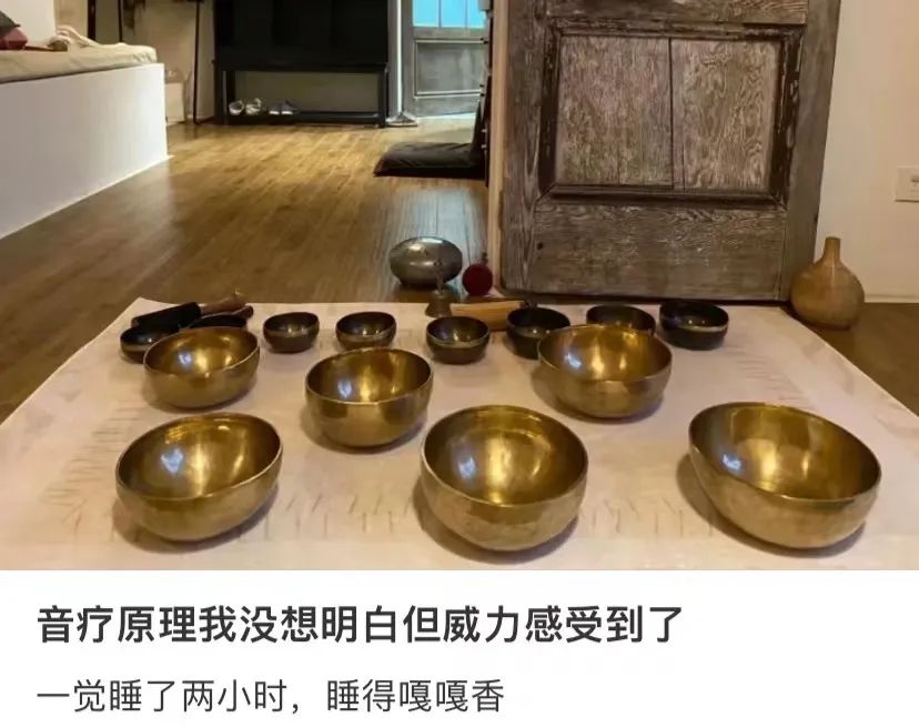 而最近火起来的音疗,则是围成一圈听疗愈师敲敲音钵——目的是疗愈心灵,但你大概率会在“音乐频率和身体的同频共振”中沉沉睡去。