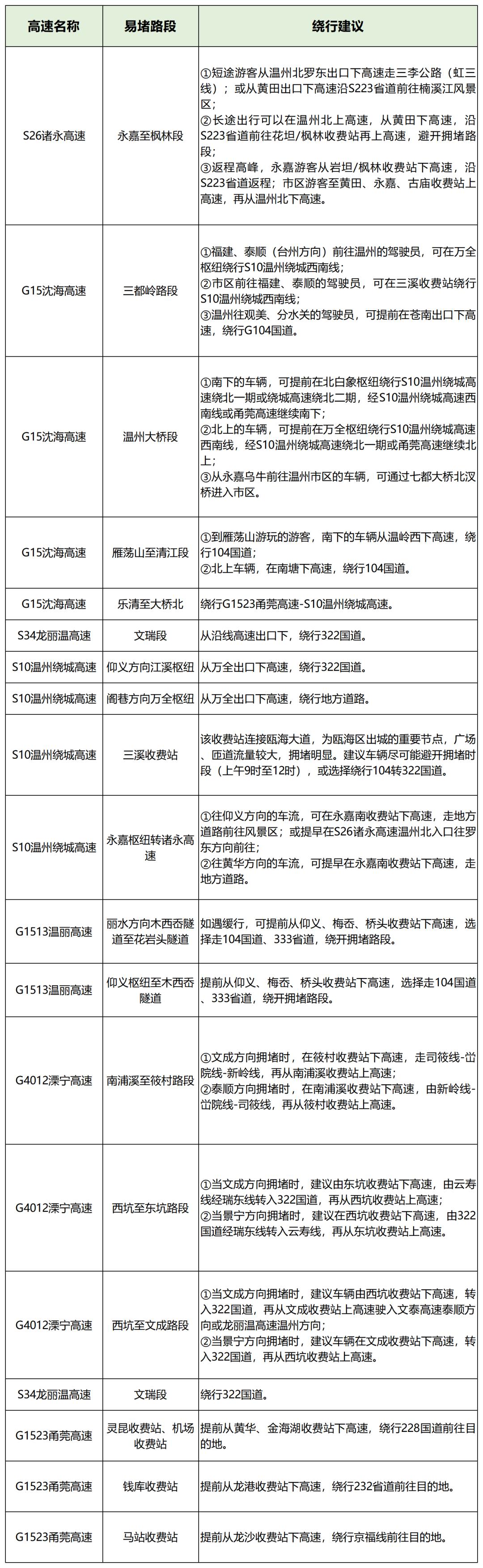 1.预计S10温州绕城高速江溪枢纽双向流量较大,车辆可提前从万全或荆谷收费站下高速,绕行322国道。