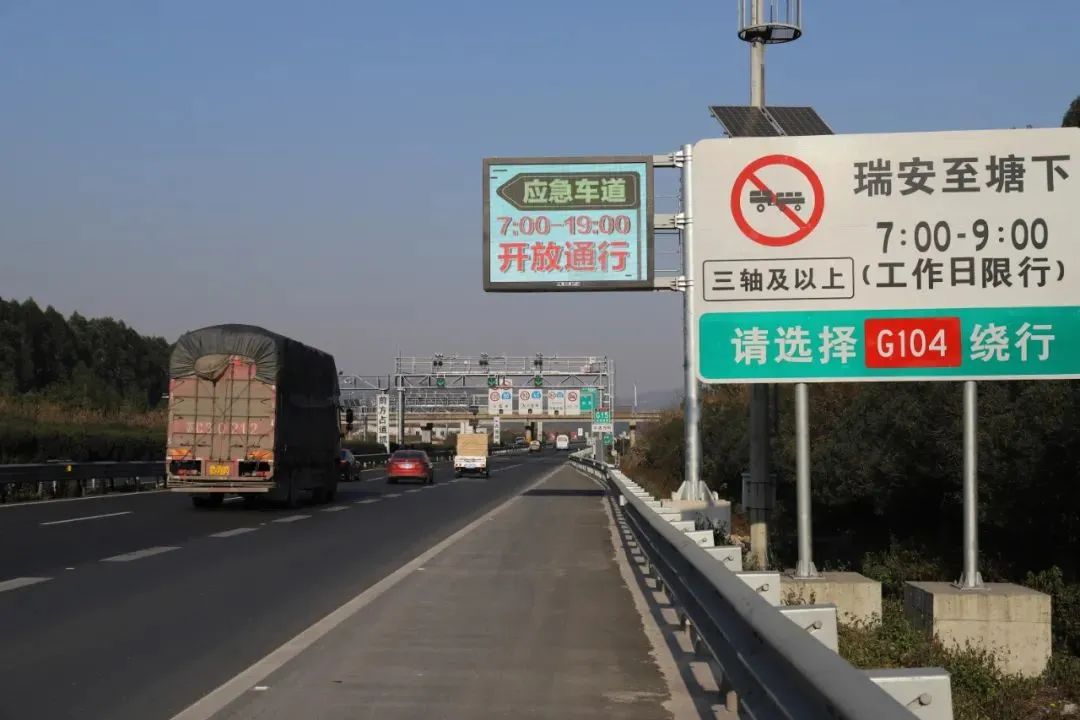 为提升通行效率,沈海高速温瑞段推出“可变应急车道”模式:每天7时至19时允许社会车辆借助应急车道通行(指示灯显示为绿色),其他时间禁止社会车辆驶入(故障、事故车辆除外),禁行时段驶入将会被电子警察抓拍。