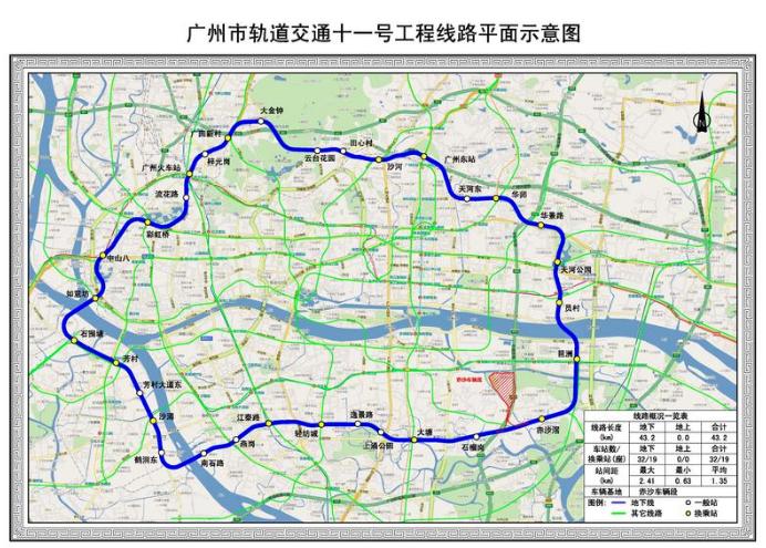 地铁十一号线(火车站-琶洲-火车站)是广州地铁的第一条环线。截至目前,该线路32座车站中,1座正进行前期准备工作,2座已开通,23座车站已封顶,其余6座正在进行土建施工;32个区间中,1个已建成开通,29个已贯通,2个进行土建施工;赤沙车辆段土建累计完成94%,机电累计完成36%。全线15座车站开始机电施工,累计完成29%;区间短轨敷设累计完成30%;供电累计完成29%;全线29个变电所中有11个进场施工,赤沙滘主变电站土建施工中。
