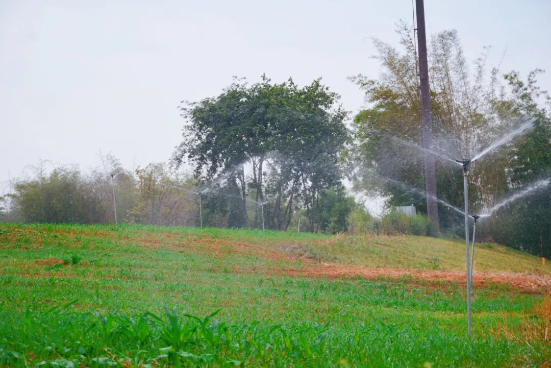 成都经开产投集团下属企业成都兴东乡村发展集团有限公司在确保喷灌系统正常使用的同时,针对喷灌系统无法覆盖的盲区,紧急组织了130余台移动喷灌机、80余台抽水机、6辆洒水车同步作业,日均工作300余个台班。采用轮灌措施,每日组织200至300余名工人作业,日均灌溉3000余亩。