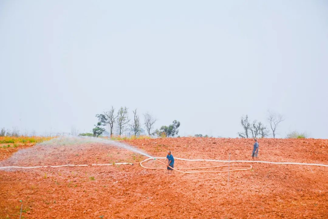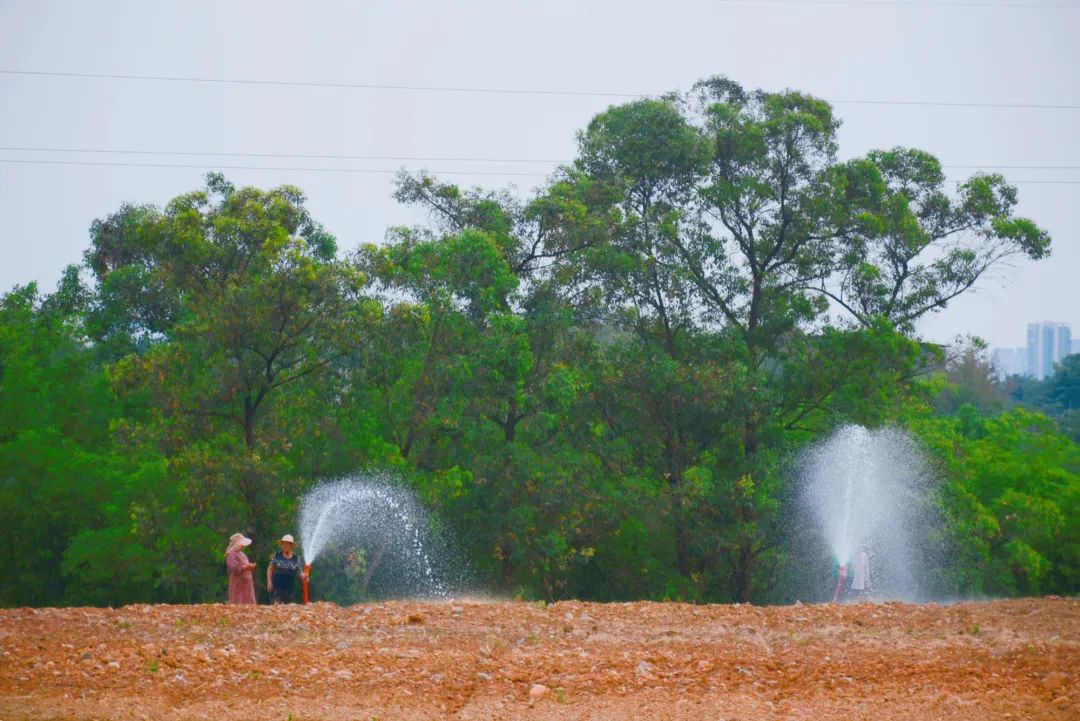 在喷灌、喷带等设施覆盖不到的地角边缘,工人们正拖动水管、架起水枪,利用人工喷灌枪对其进行灌溉。随着哗哗的水不断地喷洒出来,土地颜色变深,干涸现象得到缓解。