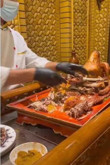 等待羊肉皮烤至金黄再取出,最后再在金黄的羊上撒上芝麻,一只热气腾腾的烤全羊出现人们眼前了。羊肉串
