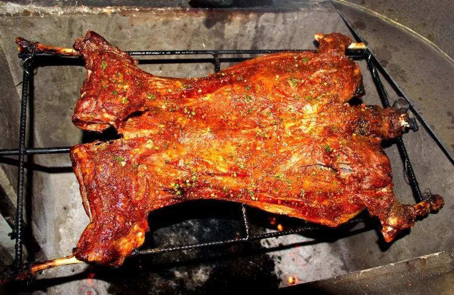 杀了羊,必须将整只羊与咸盐、啤酒、洋葱一同腌制,等羊肉完全没有了膻味方可取出。接下来把腌制好的羊,整个串在柳枝上,拿木炭在羊下面烤,边烤边旋转羊身,并撒上孜然、辣椒粉等调味品。