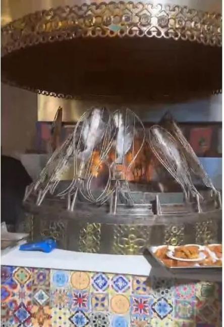 一串烤乳鸽是将半只鸽子分成四块,炙烤的能源是事先准备好的杏树、桑树木炭。通过盐、白胡椒、孜然等调味品,并不时翻动烤架上飘香的乳鸽串。