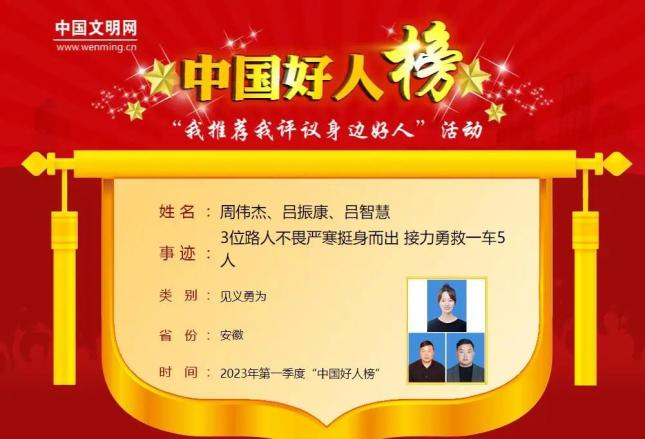 06不畏严寒挺身而出、接力勇救一车5人的阜南县许堂乡陈坡村村民周伟杰,阜阳市颍泉区周棚办事处茨河居委会居民吕振康、吕智慧。