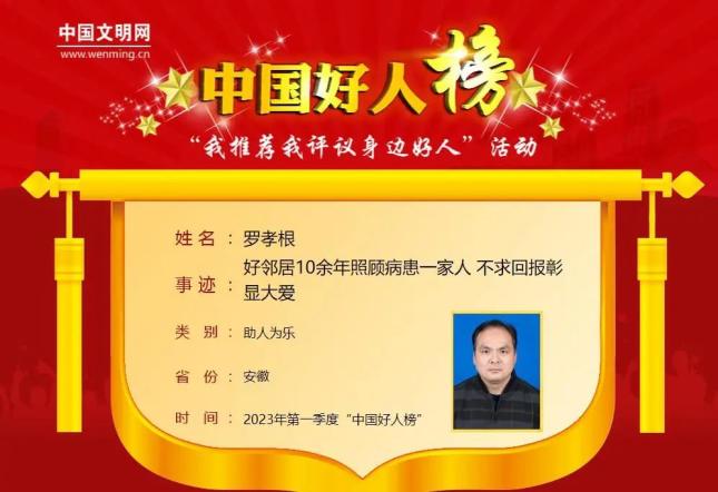 罗孝根荣登2023年第一季度“中国好人榜”!