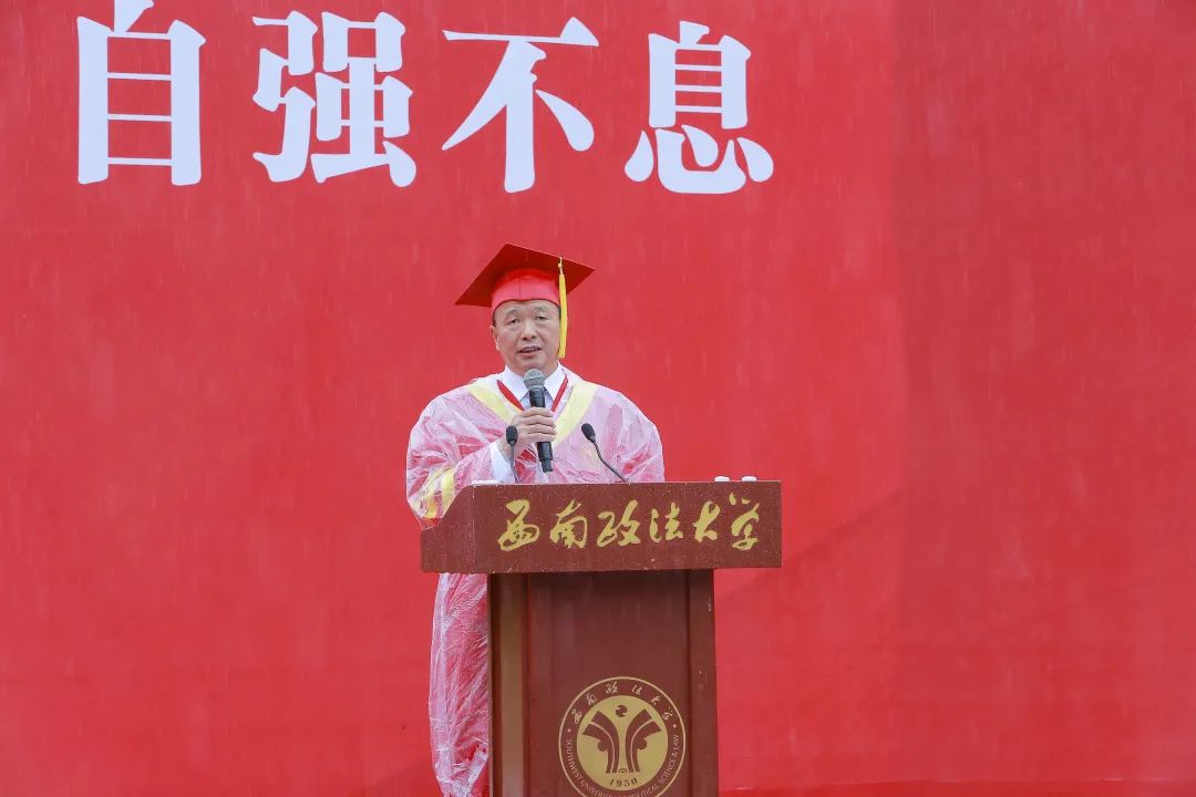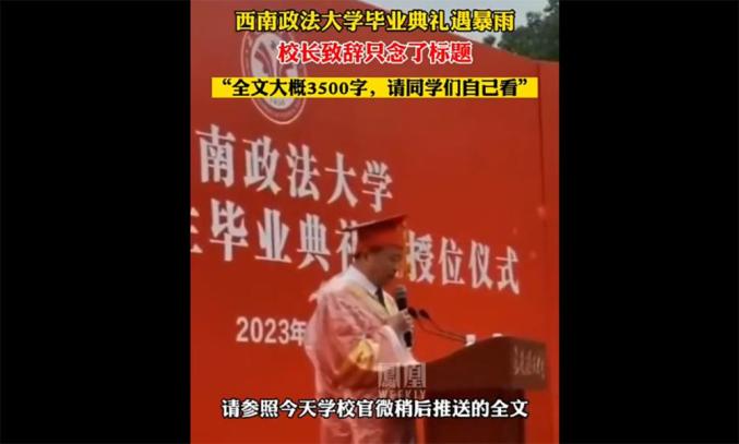 6月21日,山城重庆,西南政法大学毕业典礼当天突遇大雨,为了让学生们少淋雨,校长付子堂发表致辞时把原本准备的3500字讲稿内容总结成了两个知识点——“知行合一致良知,德法兼修事上练”,他补充说“这本来是我典礼致辞的标题,全文阐释请参照稍后学校官微的推送”。