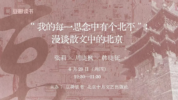 《散文中的北京》收录了二十七位作者关于北京的散文佳作。6月29日,豆瓣读书联合北京十月文艺出版社,特邀北京师范大学文学院教授、博士生导师、《散文中的北京》主编张莉,北京老舍文学院专业作家周晓枫,中国作家协会会员、小说家、编辑韩晓征,以《散文中的北京》为中心,与大家聊聊那些关乎北京的文与人。