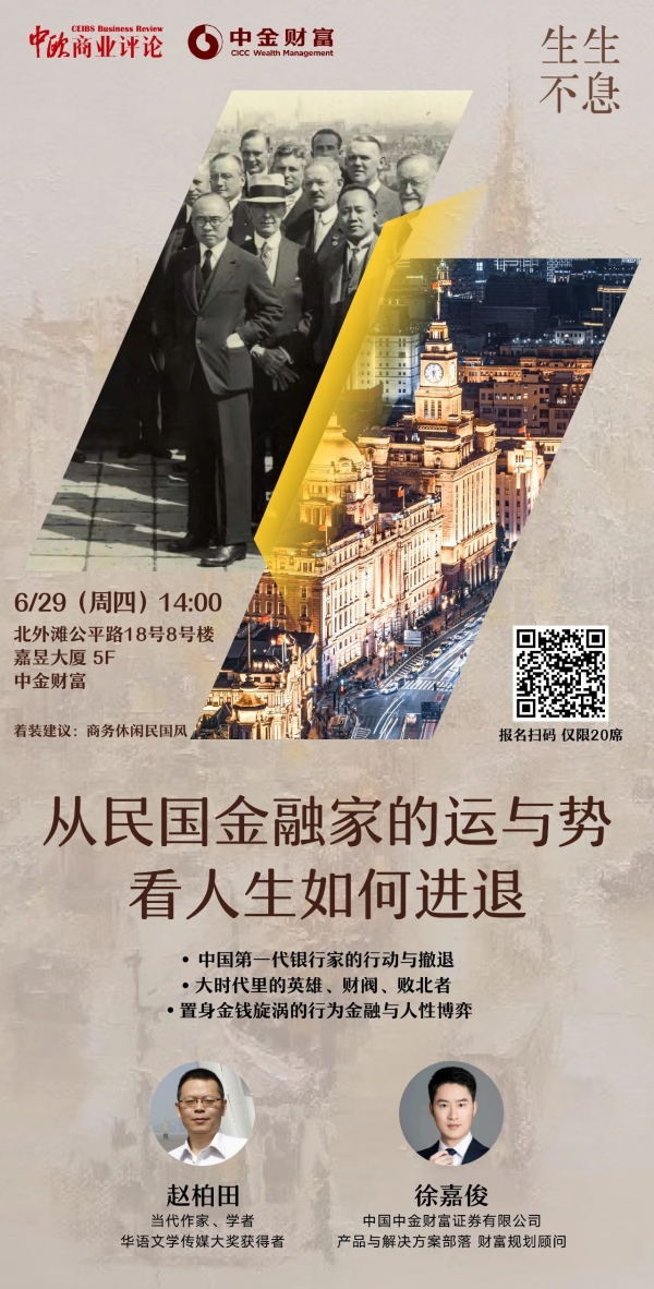 在当代作家、学者赵柏田的新著《银魂:张嘉璈和他的时代》中,他以民国金融缔造者张嘉璈作为枢纽性人物,书写了在资本与权力的对立、依存、冲突、纠缠中,壮志未遂的初代银行家们的故事。6月29日,《中欧商业评论》邀请赵柏田老师现场分享“从民国金融家的运与势,看人生如何进与退”。