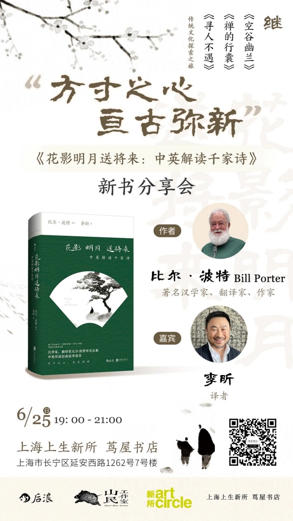 作为备受国内外读者喜爱的美国汉学家,比尔·波特再次探寻中华艺术之大雅,带来凝聚毕生心血的译作《花影明月送将来:中英解读千家诗》。书中不仅包含原诗和对照的英文翻译,还有历史背景的阐述、各种社会习俗介绍以及意向评论,所有这些都为欣赏和理解原诗,营造充分的阅读氛围。6月25日,我们特别邀请到比尔·波特,以及译者李昕做客茑屋书店,一起聊聊新书《花影明月送将来:中英解读千家诗》的译注故事,探讨时代交织下“诗人”与“诗”的命运轨迹,从一首首琅琅上口的千家诗中,共赏古代诗词的瑰丽,领略中华文化的博大精深。