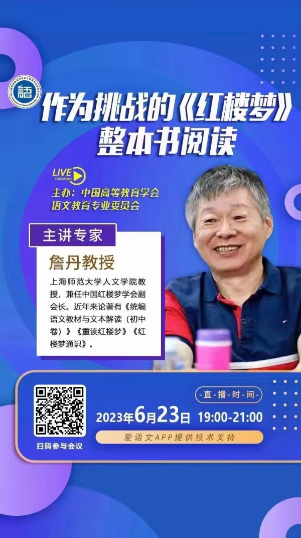 教育部颁布的《普通高中语文课程标准(2017年版)》将“整本书阅读与研讨”作为18个学习任务群之一,列入教学内容。为贯彻落实新课标精神,新的高中语文统编教材已将《红楼梦》作为“整本书阅读”单元编入必修下册。《红楼梦》是我国古代小说艺术的一座高峰,有近100万字,对于高中生来说,整本书阅读是不是太难了?6月23日,我们邀请上海师范大学人文学院教授、中国红楼梦学会副会长詹丹老师来为大家讲讲作为挑战的《红楼梦》整本书阅读。