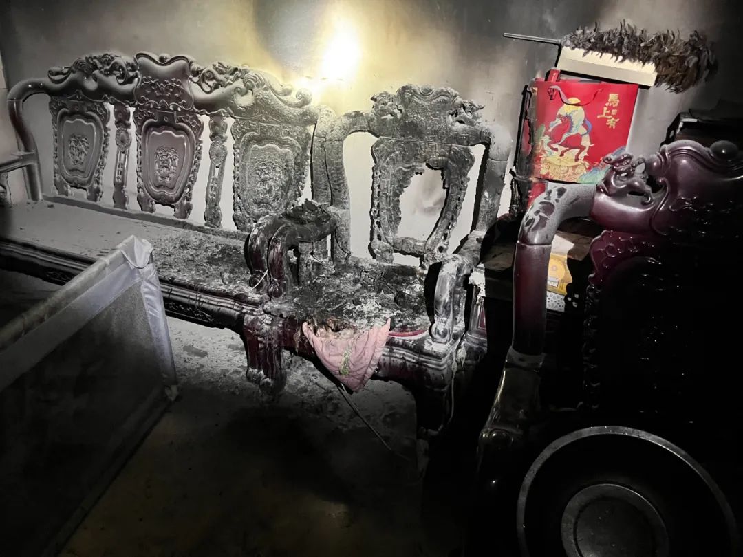 未关门的房间被熏黑,房内物品大多被烧毁经初步勘察,该起火灾的起火原因疑似电器线路故障,具体原因正在进一步调查中。