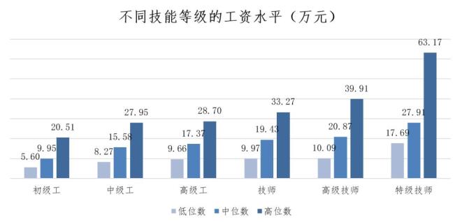 从各等级中位数到高位数的增长空间看,等级越高增长空间越大。特级技师、高级技师、技师、高级工、中级工和初级工的工资成长空间依次为35.26、19.04、13.84、11.33、12.37和10.56万元,各等级间的倍数比为3.4:1.8:1.3:1.1:1.2:1。