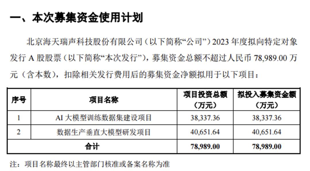 6月21日晚,海天瑞声发布定增公告,拟募资不超过7.9亿元,用于AI大模型训练数据集建设项目、数据生产垂直大模型研发项目。