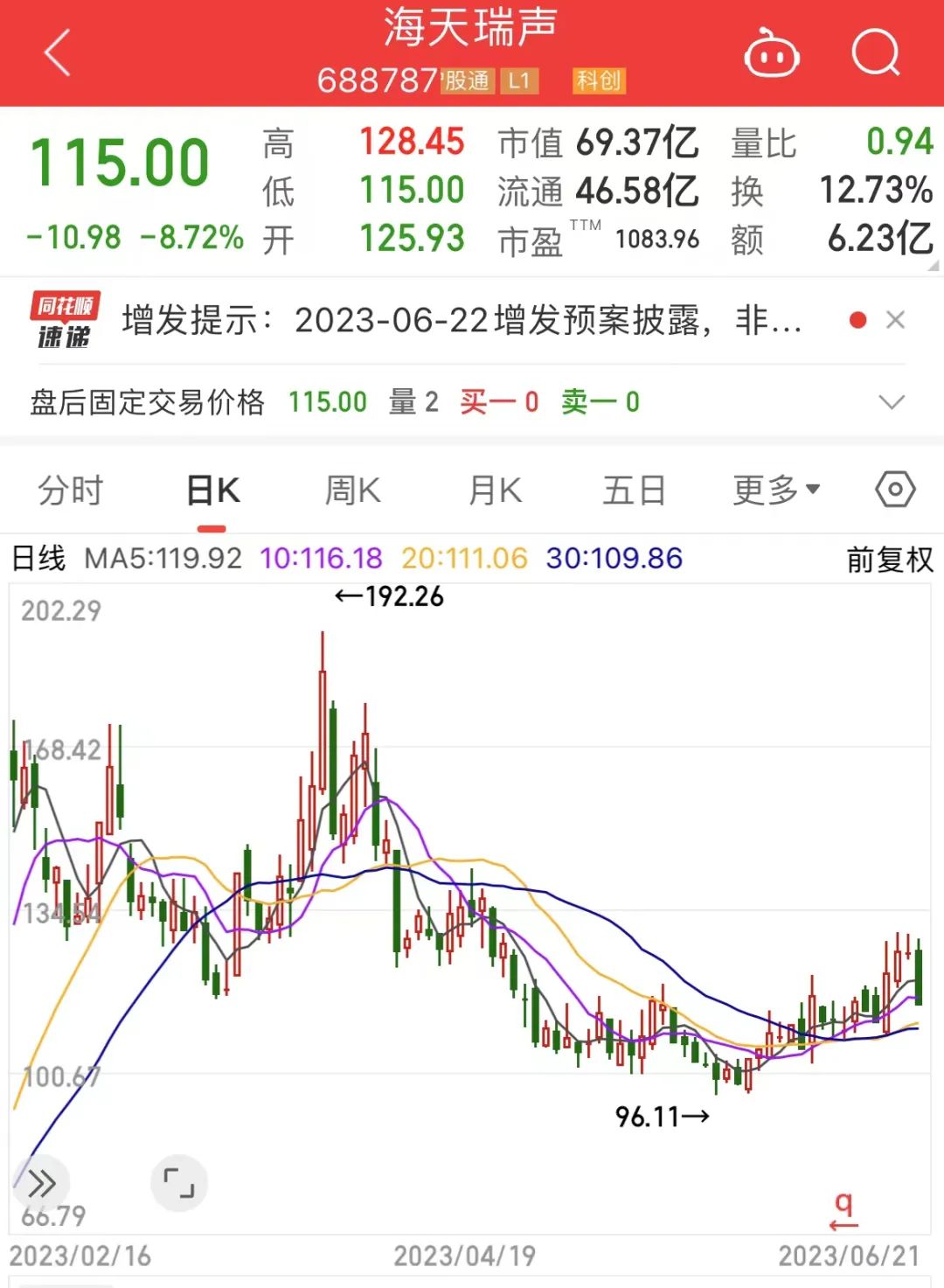 截至最新,海天瑞声报收115元/股,最新市值69.37亿元。目前,该股股价较年内高点已经回撤近30%,但年内涨幅仍超170%。
