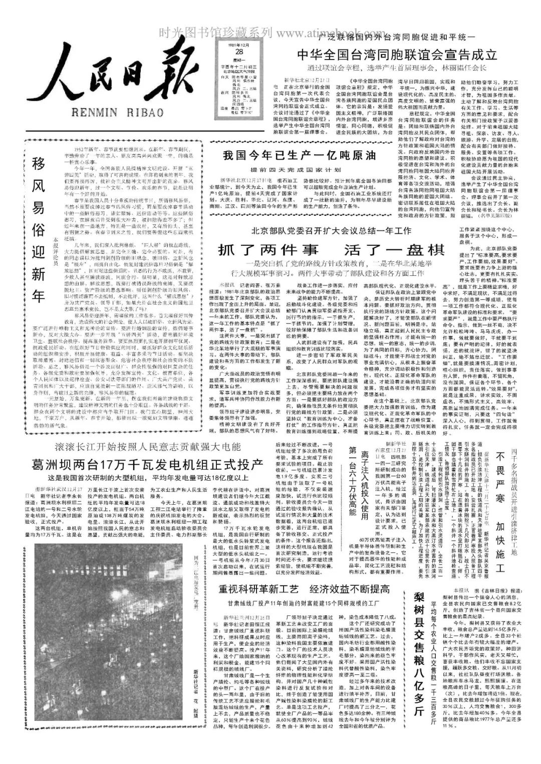 1981年12月28日,《人民日报》头版报道:滚滚长江按照人民意志贡献强大电能,葛洲坝两台17万千瓦发电机组正式投产。举国欢腾鼓舞,誉满神州大地。