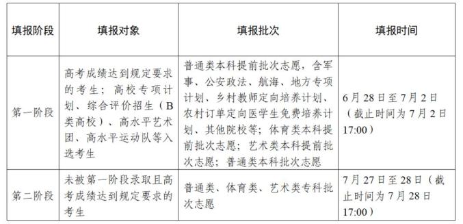 第一阶段:6月28日至7月2日(截止时间为7月2日17:00),填报本科院校专业组志愿,包括普通类本科提前批次志愿,含军事、公安政法、航海、地方专项计划、乡村教师定向培养计划、农村订单定向医学生免费培养计划、其他院校等;体育类、艺术类本科提前批次志愿;普通类本科批次志愿。