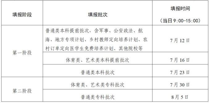 第二阶段:7月27日至28日(截止时间为7月28日17:00),填报专科批次院校专业组志愿。凡第一阶段未被录取且符合填报条件的考生均可填报,包括普通类、体育类、艺术类专科批次志愿。