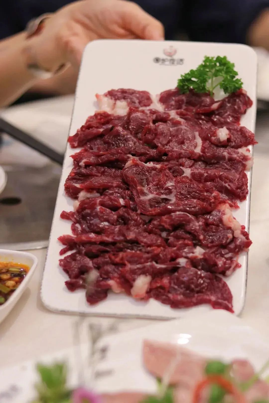 在潮州吃牛肉火锅,不同部位的牛肉装在盘子里依次排开上桌,气势上已经赢了。