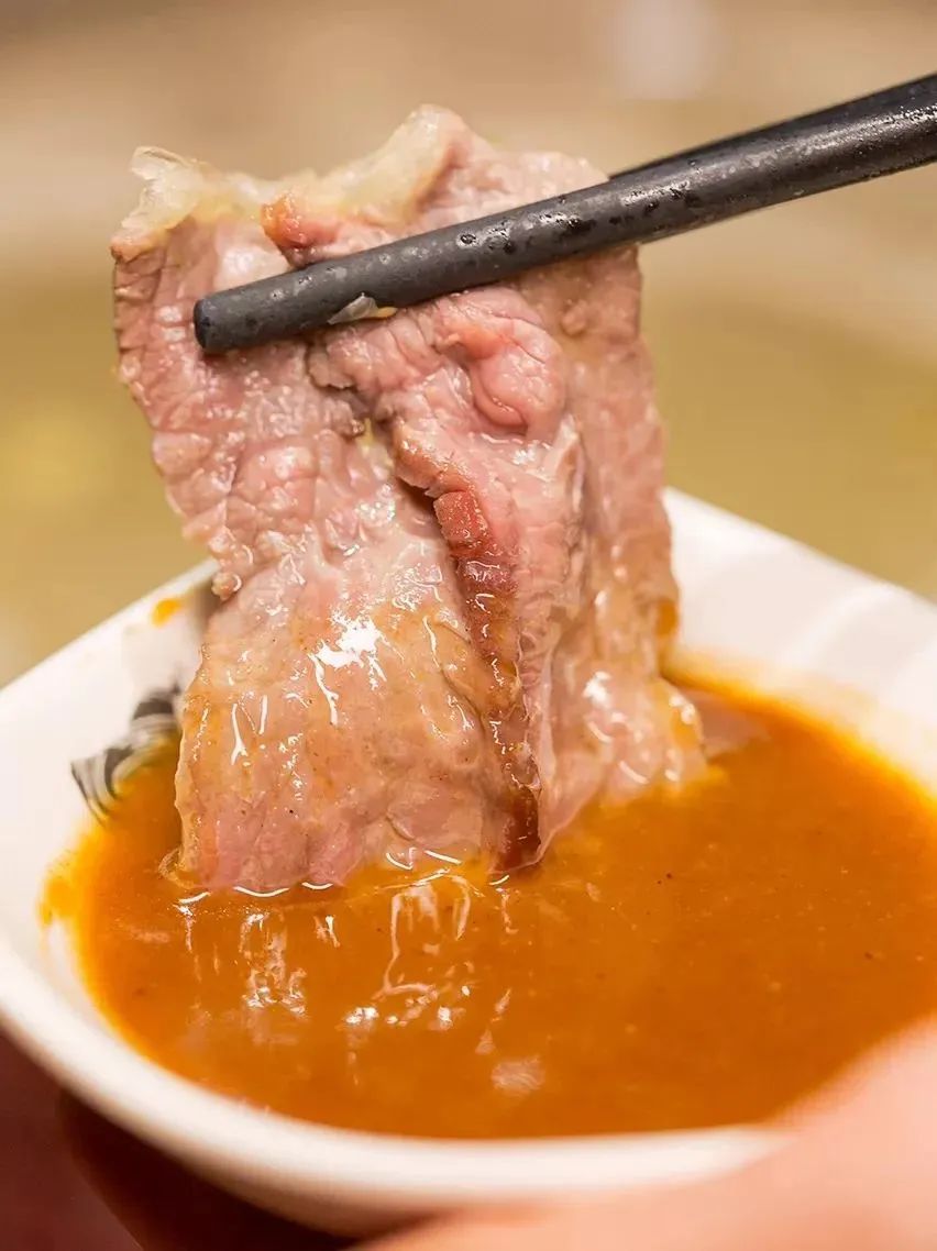 /牛肉和沙茶的完美搭档/潮州人吃牛不喜欢太多酱料,吃的是牛肉的原汁原味。最多配个沙茶酱,一对黄金搭档。就像虾枣配桔油,蚝烙配鱼露,普宁豆干配韭菜盐水,对潮州人来说,牛肉就要配沙茶酱。