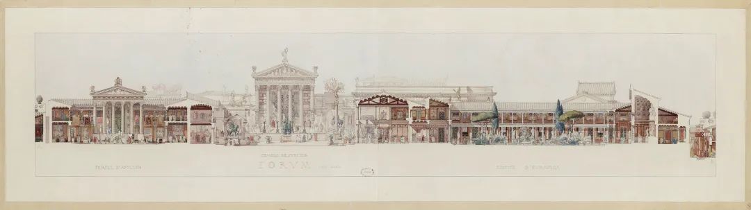 庞贝大广场周围的建筑复原图,1910年,L·Jaussely,法国国立高等美术学院从左至右包括:福尔图纳·奥古斯塔神庙, 大会堂、食品市场、公共会场、统领办公室
